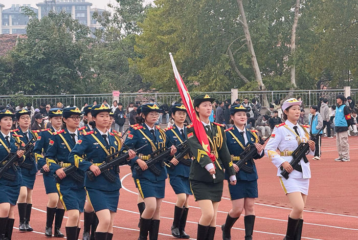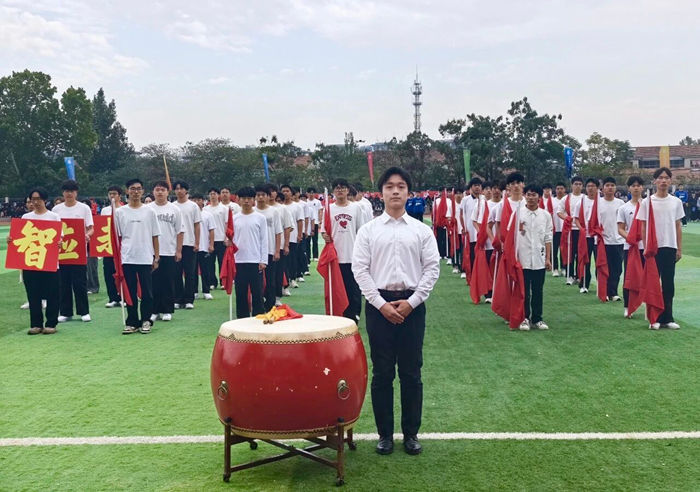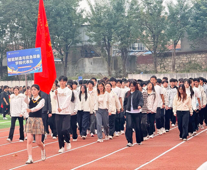 开幕式上,雄壮的《运动员进行曲》响彻全场。国旗护卫队身着整齐服装,迈着铿锵步伐引领入场队伍,鲜红的国旗在阳光下沙沙作响;校旗队紧随其后,展现着学校的精神风貌。各学院方阵依次登场,同学们身着统一服装,精神抖擞、步伐整齐。有的方阵手挥旗帜,挥舞间绘就青春色彩;还有的带着自制的加油牌,字里行间满是少年意气,蓬勃的朝气赢得全场阵阵喝彩。